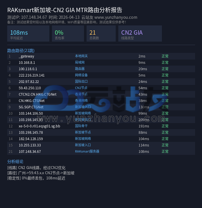 - CN2 GIA经过CN2优化,延迟最低108ms,0%丢包